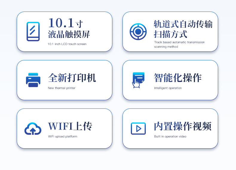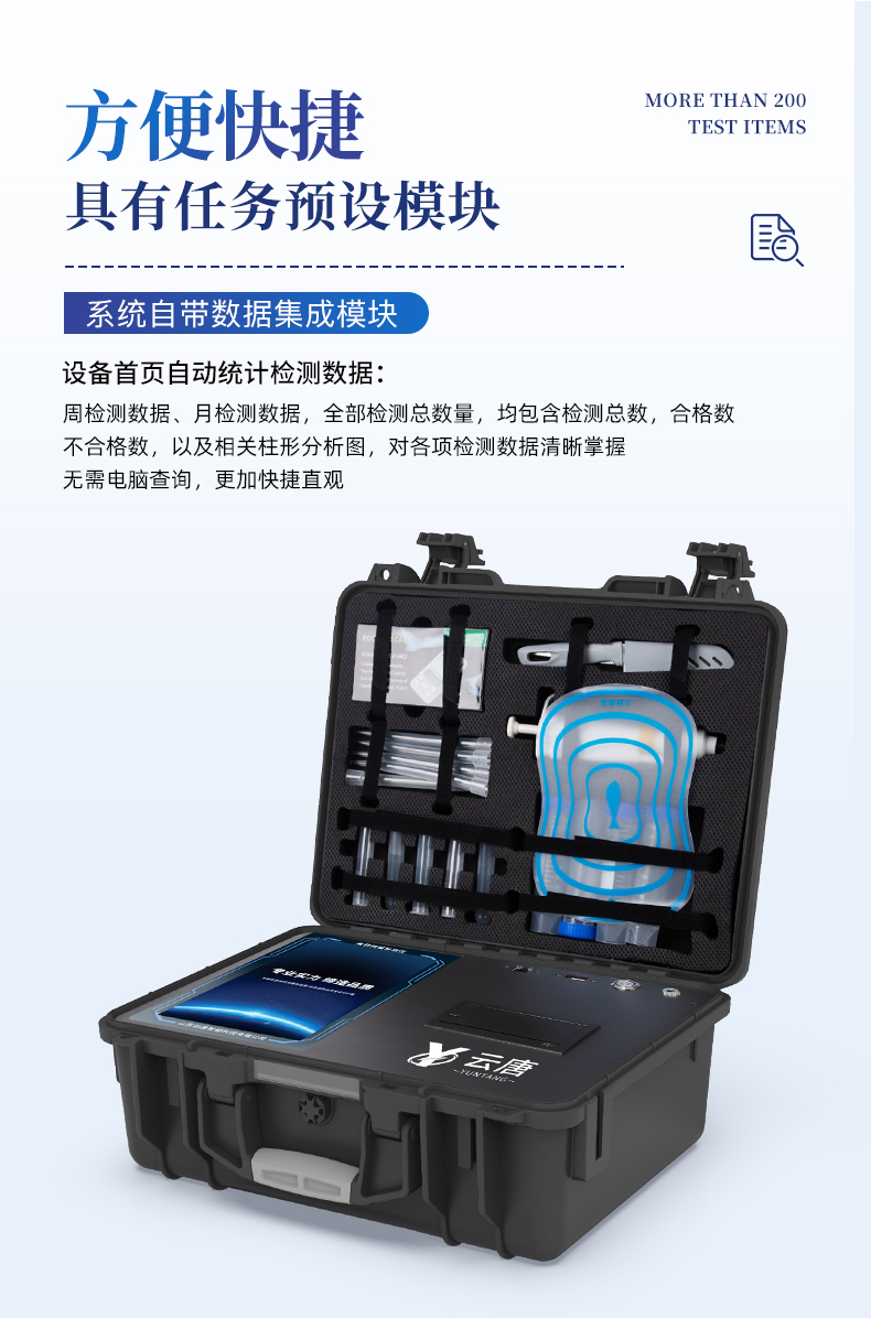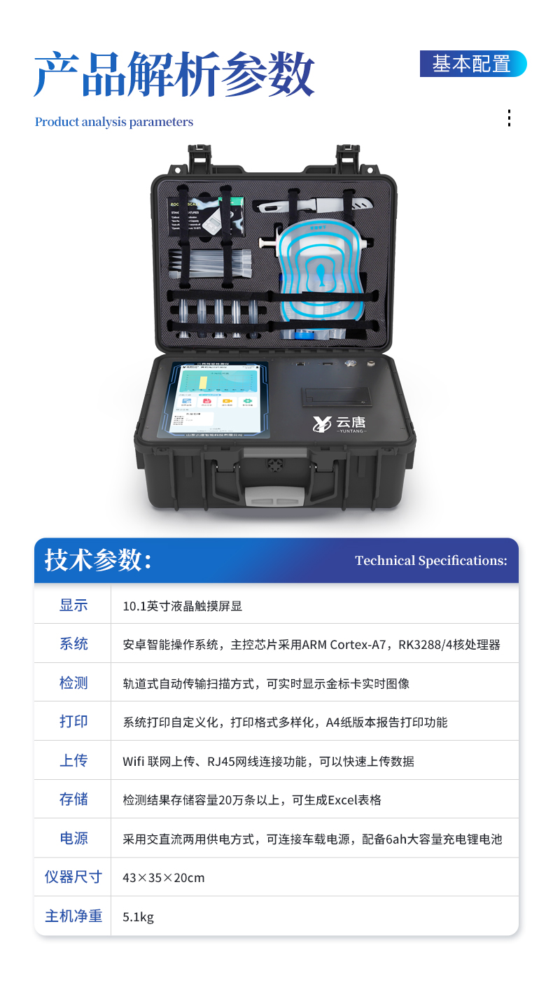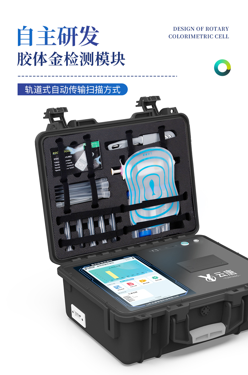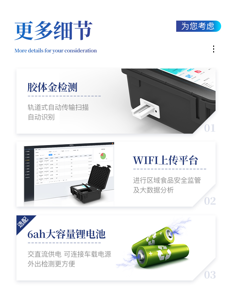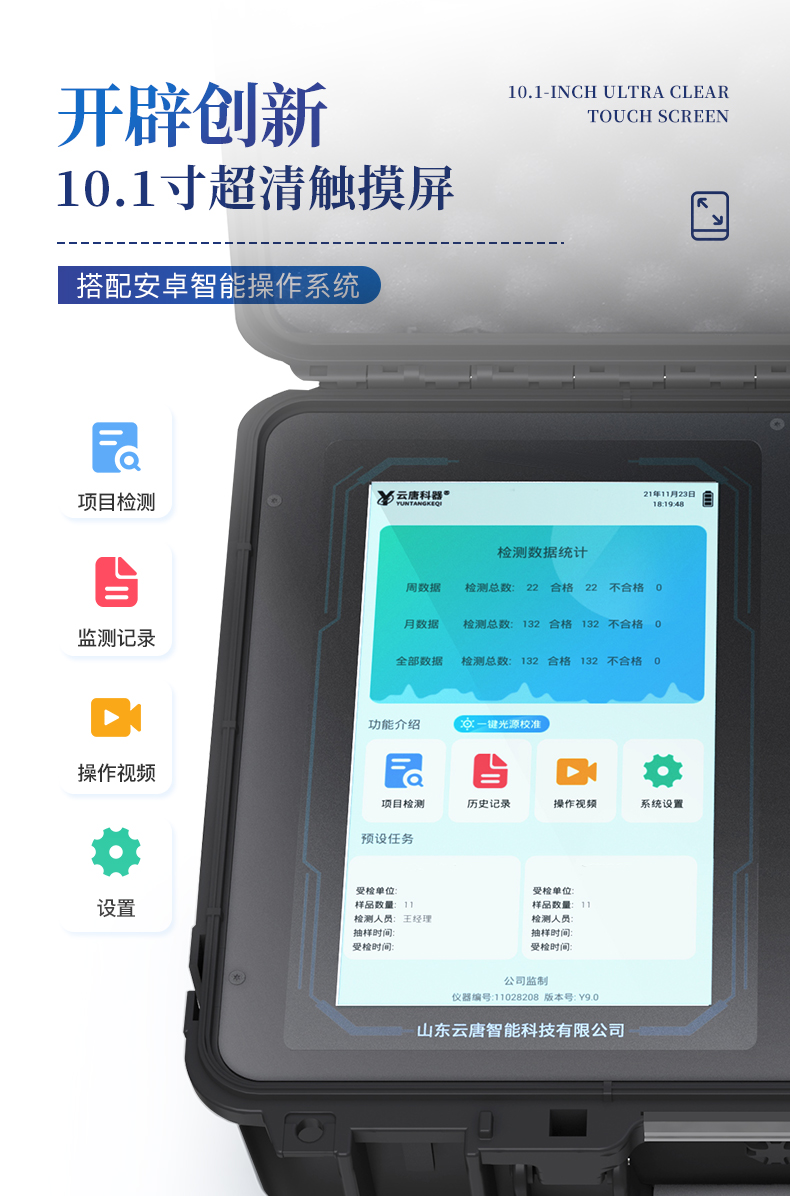 | 1、儀器采用10.1英寸液晶觸摸屏顯,搭配運行安卓智能操作系統,主控芯片采用ARM Cortex-A7,RK3288/4核處理器,主頻1.88Ghz,運轉速度更快速,性能更強。 | 2、儀器功能包括:膠體金檢測模塊、數字化管理模塊、無線通訊模塊等,可以滿足同一軟件下實現所有檢測項目的檢測,并在同一窗口展示檢測結果。 | 3、一體化便攜式快檢設備,采用交直流兩用供電方式,可連接車載電源,配備6ah大容量充電鋰電池,可以滿足現場及流動檢測使用的需求。儀器尺寸:43×35×20cm, 主機凈重:5.1kg | 4、系統自帶數據集成模塊,設備首頁自動統計檢測數據包含:周檢測數據、月檢測數據,全部檢測總數量,均包含檢測總數,合格數,不合格數,以及相關柱形分析圖,對各項檢測數據清晰掌握,無需電腦查詢,更加快捷直觀。 | 5、儀器具有任務預設模塊,可在樣品送檢前提前預設樣品名稱、檢測指標、送檢單位等信息,樣品送檢時一鍵調取保存信息,檢測更加方便快捷。 |