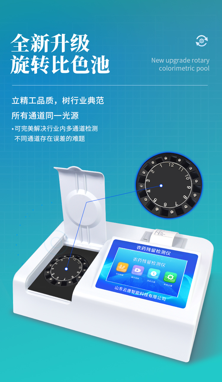 旋轉(zhuǎn)式農(nóng)藥殘留檢測(cè)儀8個(gè)檢測(cè)通道,可以同時(shí)測(cè)試多個(gè)樣品,循環(huán)檢測(cè),即放即檢,每個(gè)樣品由程序控制分別獨(dú)立工作,不會(huì)互相干擾。··· 熱線:133-7109-8225
