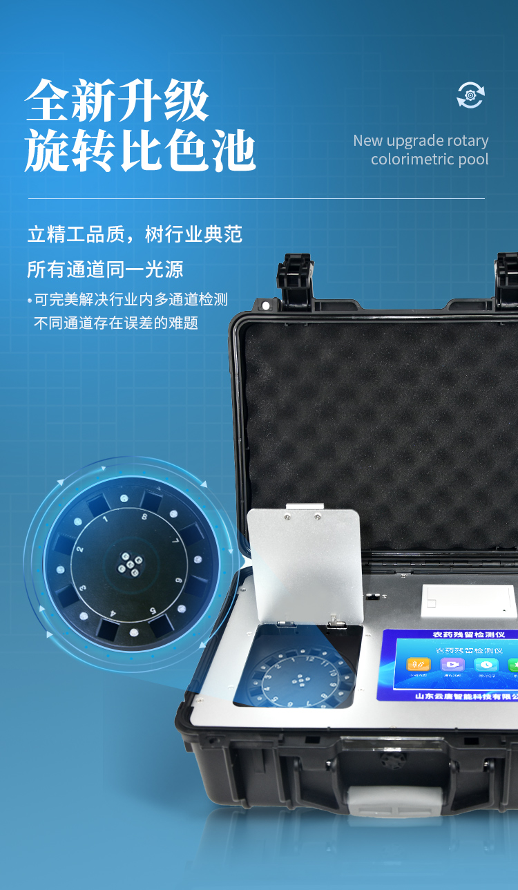 山東云唐智能科技有限公司生產的農藥殘留檢測儀廣泛應用于主要用于蔬菜、水果、茶葉、糧食、農副產品等食品中農藥殘留的快速檢測,依據國標GB/T5009.199-2003進行檢測,適用于果蔬茶生產基地以及農貿批發銷售市場現場檢測,餐館、學校、食堂、家庭果蔬加工前的安全速測等。