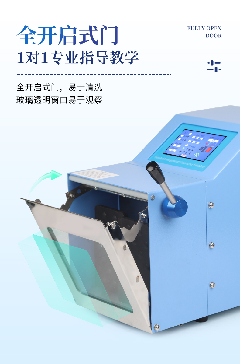 ●5英寸液晶顯示屏。 ●可儲存三組工作程序。 ●可調整的均質時間。 ●均質速度可調節或固定。 ●拍擊器可調整前后距離。 ●無菌一次性濾袋,保證衛生。 ●全開啟式門,易于清洗。 ●玻璃透明窗口易于觀察 。 ●樣品與均質儀無接觸,如無樣品泄露則不需進行系統清洗. ●均質柔和、樣品零污染、無損傷、不升溫、不需要滅菌處理,不需洗刷器皿。