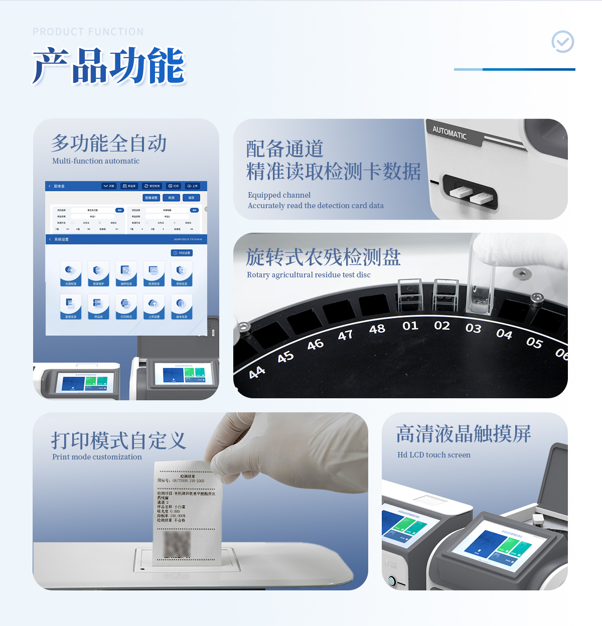 | 1. 試劑位置:3個 | 2. 農殘檢測盤:旋轉48通道比色盤,可任意選擇檢測通道,自動對應選擇通道。 | 3. 膠體金通道:6個單通道,1個三聯卡通道,可讀取檢測卡結果,自動采集、處理分析,自動判斷檢測結果,并具備自動判空功能。 | 4.系統配置:10.1寸高清液晶觸摸屏,采用ARM Cortex-A7,RK3288/4核處理器,運行內存1GB。Android7.1.1 系統分辨率1280×800。 | 5.恒溫系統:具有自動加溫溫控系統,精準恒溫37℃,精度±0.1℃。 | 6.添加系統:儀器按照試劑要求自動、按時、按量加入試劑,并且自動對未正常放置的樣本或異常的樣本進行檢查并提示。 | 7.清洗功能:儀器具備回流及自動清洗管路功能,避免試劑污染。 | 8.混勻功能:設備具備自動混勻功能。 | 9.光源校準:設備可自動校準,確保檢測準確度。 | 10.實時監(jiān)控:儀器測試過程中屏幕顯示運行狀態(tài),可實時查看。 | 11.數據存儲:內部存儲16GB,可存儲500萬條數據。 | 12.樣品多選功能:設備具備樣品一鍵多選功能,選擇樣品自動匹配檢測通道。 | 13.項目預設:可提前設置單個及多個相同或不相同的檢測任務,可單次或者多次調取,減少檢測時間。 | 14.自定義打印系統:內置自定義打印系統,可按需靈活設置開啟或關閉:產品合格證(國家農業(yè)部標準),二維碼,抽樣信息、檢測信息,受檢信息等信息的打印。 | 15.A4版本報告打印功能:設備可自動生成A4版報告,A4報告帶二維碼,可掃描二維碼生成電子版,并可識別真?zhèn)巍?/td> | 16.傳輸方式:儀器配備無線通信模塊: 4G(APN)通訊模塊、Wifi模塊,藍牙傳輸模塊,同時具有USB接口以及RJ45接口能以多種方式實現數據保存和數據傳輸功能,設備數據可以同步上傳至平臺。 | 17.數據監(jiān)管系統:設備自帶監(jiān)管平臺,并可同步對接監(jiān)管平臺,數據可局域網和互聯網數據上傳,檢測結果可直接傳至食品安全監(jiān)管平臺。達到食品安全問題預估、預警。 | 18.系統遠程更新功能:無需設備返廠,即可遠程實時升級全新系統,節(jié)省時間成本及避免運輸造成設備損。 |