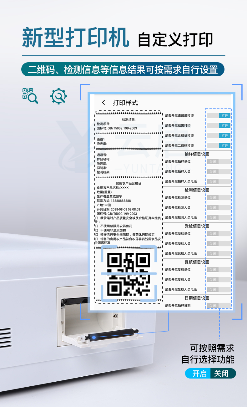 9.7.1、全新打印系統(tǒng):內(nèi)置全新打印機,新創(chuàng)自定義打印方式,可按需靈活勾選控制:產(chǎn)品合格證(國家農(nóng)業(yè)部標(biāo)準(zhǔn)要求),二維碼,抽樣信息、檢測信息,受檢信息、復(fù)核信息、抽樣日期、檢測日期等信息的打印。