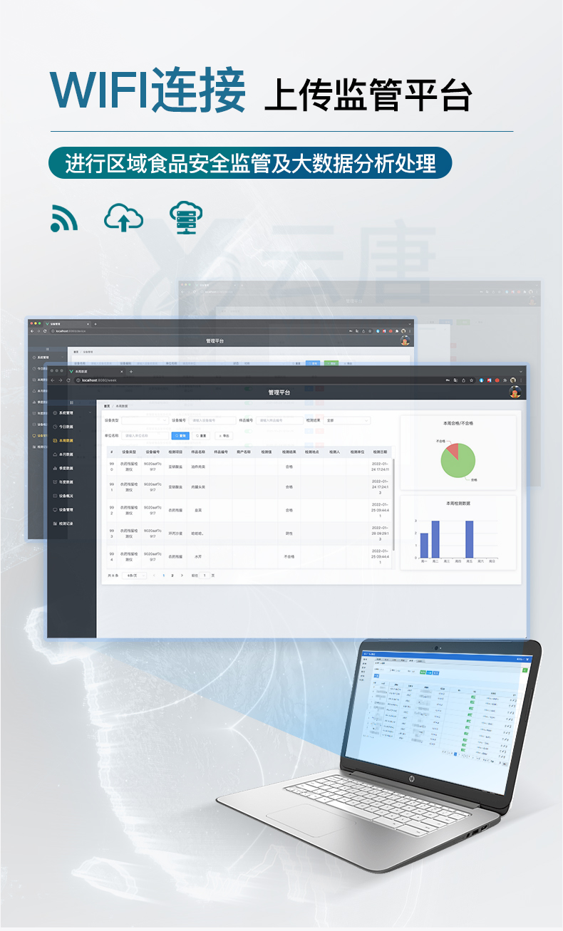 9.6、數(shù)據(jù)監(jiān)管系統(tǒng):同步對接監(jiān)管平臺,數(shù)據(jù)可局域網(wǎng)和互聯(lián)網(wǎng)數(shù)據(jù)上傳,檢測結(jié)果可直接傳至食品安全監(jiān)管平臺。進行區(qū)域食品安全監(jiān)管及大數(shù)據(jù)分析處理與數(shù)據(jù)統(tǒng)計,監(jiān)測區(qū)域食品安全長短期動態(tài)及問題預(yù)估、預(yù)警。