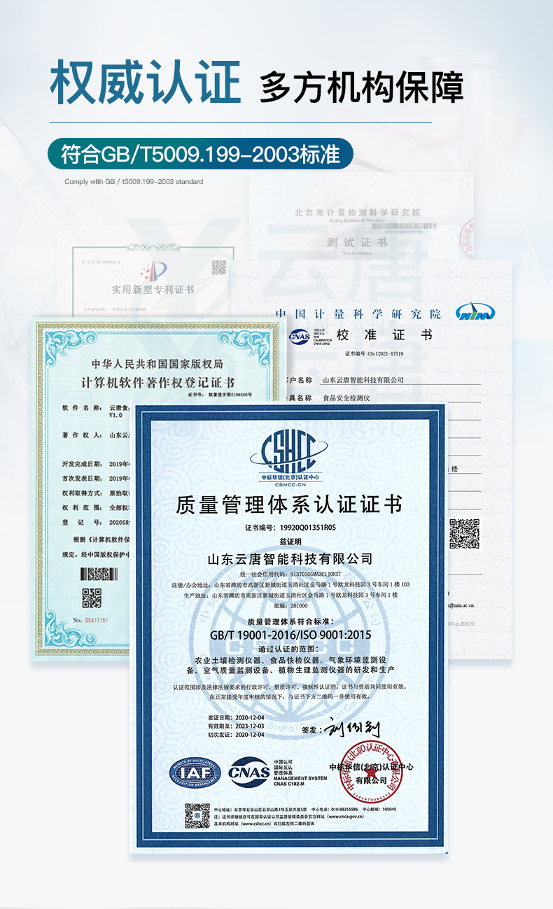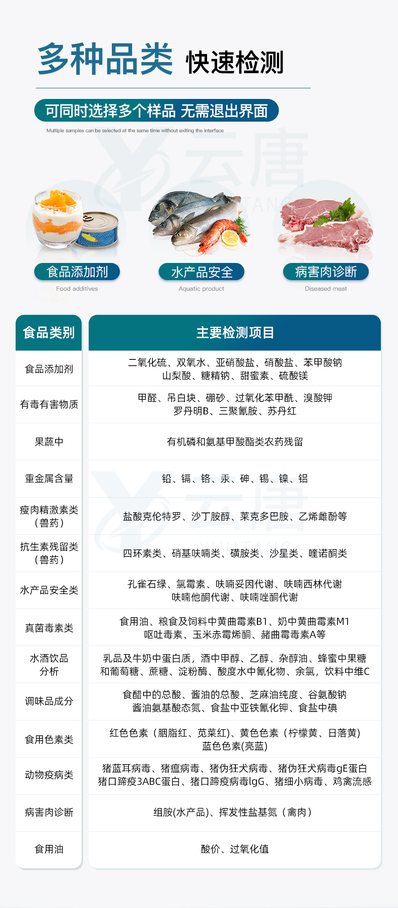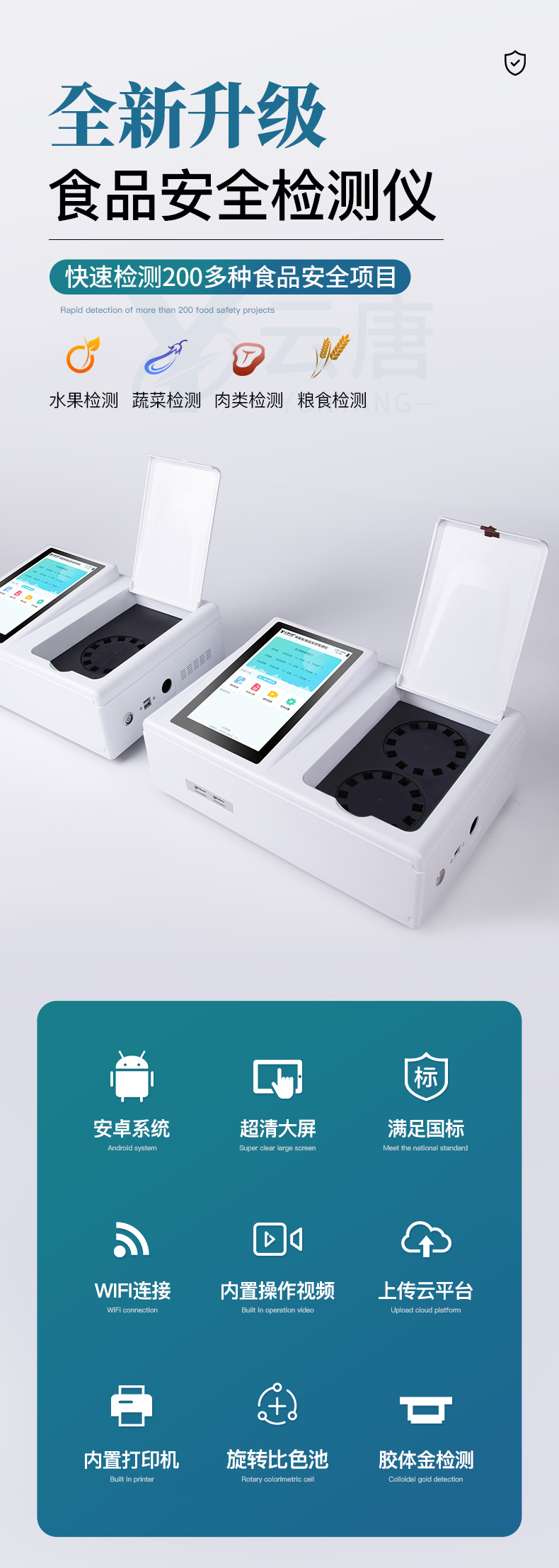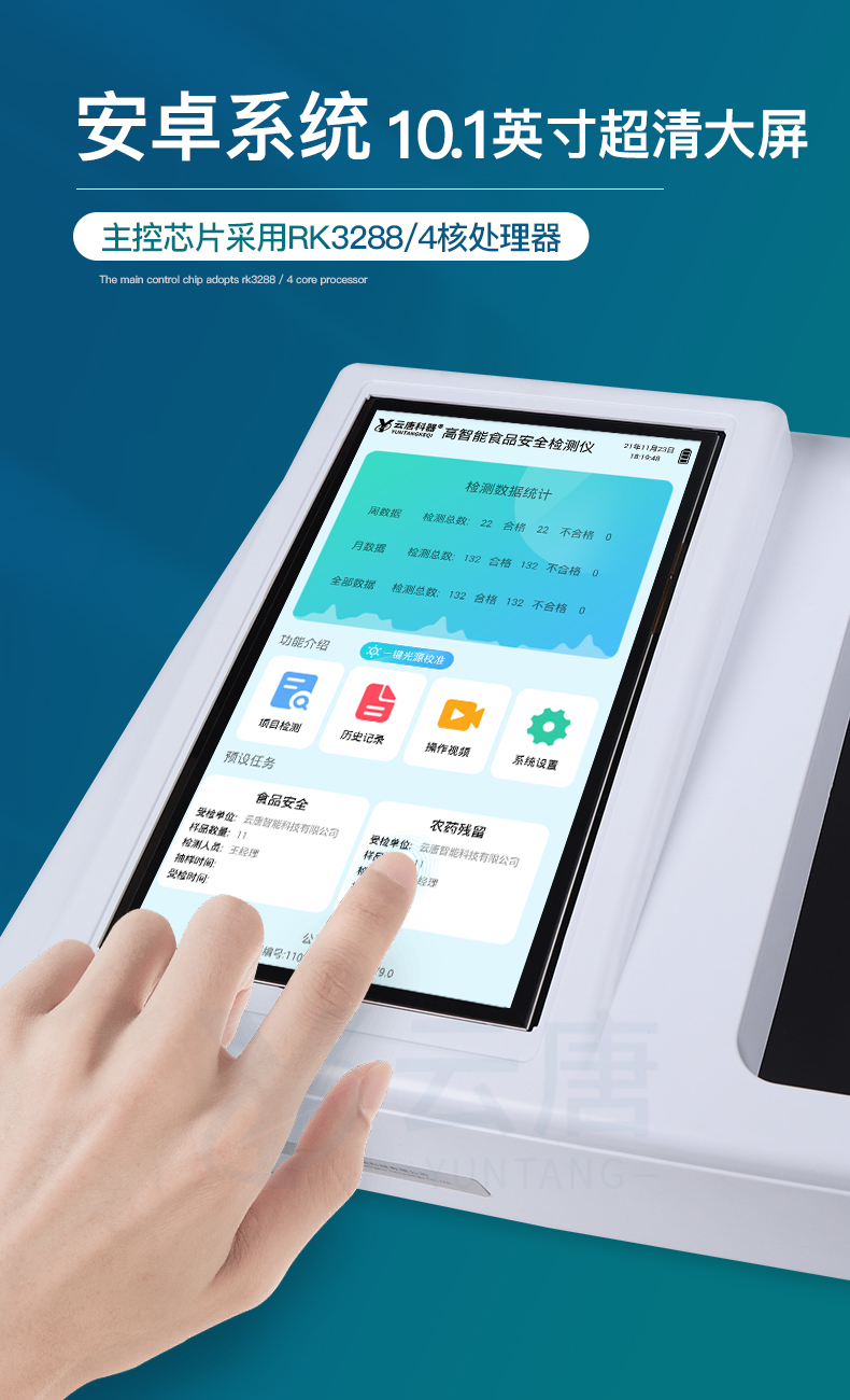 山東云唐智能科技有限公司生產(chǎn)的高智能食品安全檢測儀為集成化食品安全快速檢測分析設(shè)備,采用臺式一體化設(shè)計,可快速檢測200多種食品安全項目,包含非食用化學(xué)物質(zhì)、濫用食品添加劑、農(nóng)藥殘留、獸藥殘留、重金屬、病害肉、營養(yǎng)強化劑、抗生素類殘留、激素類殘留、真菌毒素類殘留、化學(xué)類殘留等項目的定性定量檢測。