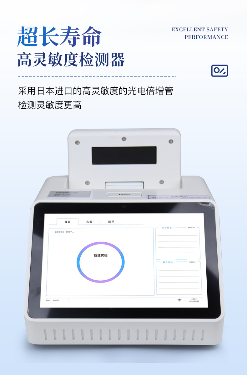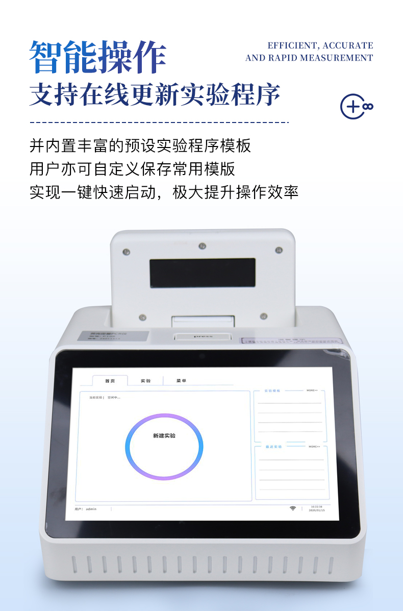 | 1.智能操作系統,實驗盡在掌握 | A雙模式靈活控制:支持通過儀器觸摸屏獨立運行,也支持通過電腦軟件進行遠程控制與數據管理,適應不同實驗場景需求。 | B程序更新與預設:支持在線更新實驗程序,并內置豐富的預設實驗程序模板,用戶亦可自定義保存常用模版,實現一鍵快速啟動,極大提升操作效率。 | C極簡啟動體驗(可選配):可定制集成攝像頭掃描系統,用戶只需掃描樣品板或程序卡的二維碼,即可自動識別并調用對應實驗程序,簡化流程,避免人為設置錯誤。 | D操作簡單:無論是觸摸屏界面還是電腦軟件,均設計得直觀易懂,新用戶也能快速上手。預置常用程序模板,進一步簡化操作流程。 | 2.精準穩定的溫控與光學核心 | A長久精準的溫控系統:采用進口***TEC半導體制冷模塊,控溫精準(±0.1°C),孔間溫度均勻性**(≤±0.3°C)。系統穩定性卓越,長期使用性能衰減小,校準周期長達數年,顯著降低維護成本與運營中斷。 | B免維護的靈敏光學系統:配備4個獨立LED光源與4個獨立光電二極管檢測器,實現四通道熒光同步精準檢測。采用超長壽命進口光源,設計壽命期內免維護,無需額外校準或更換,保障檢測結果長期一致性與高靈敏度。 | C卓越的數據質量:實驗線性相關性高(R2≥0.999),重復性優異(孔間CV值低),確保定量結果準確可靠,數據置信度高。 | 3.**便捷的數據與輸出管理 | A多重數據導出方式:支持通過USB存儲設備直接拷貝,或經由Wi-Fi無線網絡傳輸數據至本地服務器或云端,方便靈活,滿足各類實驗室數據管理習慣。 | B豐富的報告導出與打印:支持生成并導出多種格式(如PDF、Excel)的實驗報告。儀器兼容USB熱敏打印機、藍牙無線打印機及常規A4打印機,可直接在儀器上或通過電腦一鍵導出并打印專業報告,便于結果存檔與即時分享。 | 4.快速**與堅固耐用 | A升降溫速度快:優化設計的溫控系統具備高速升降溫能力,顯著縮短單次循環與整體檢測時間,提升實驗通量。 | B超長使用壽命:核心部件均選用工業級耐用材料與設計,整機運行穩定可靠,致力于為用戶提供長久的投資回報。 |
