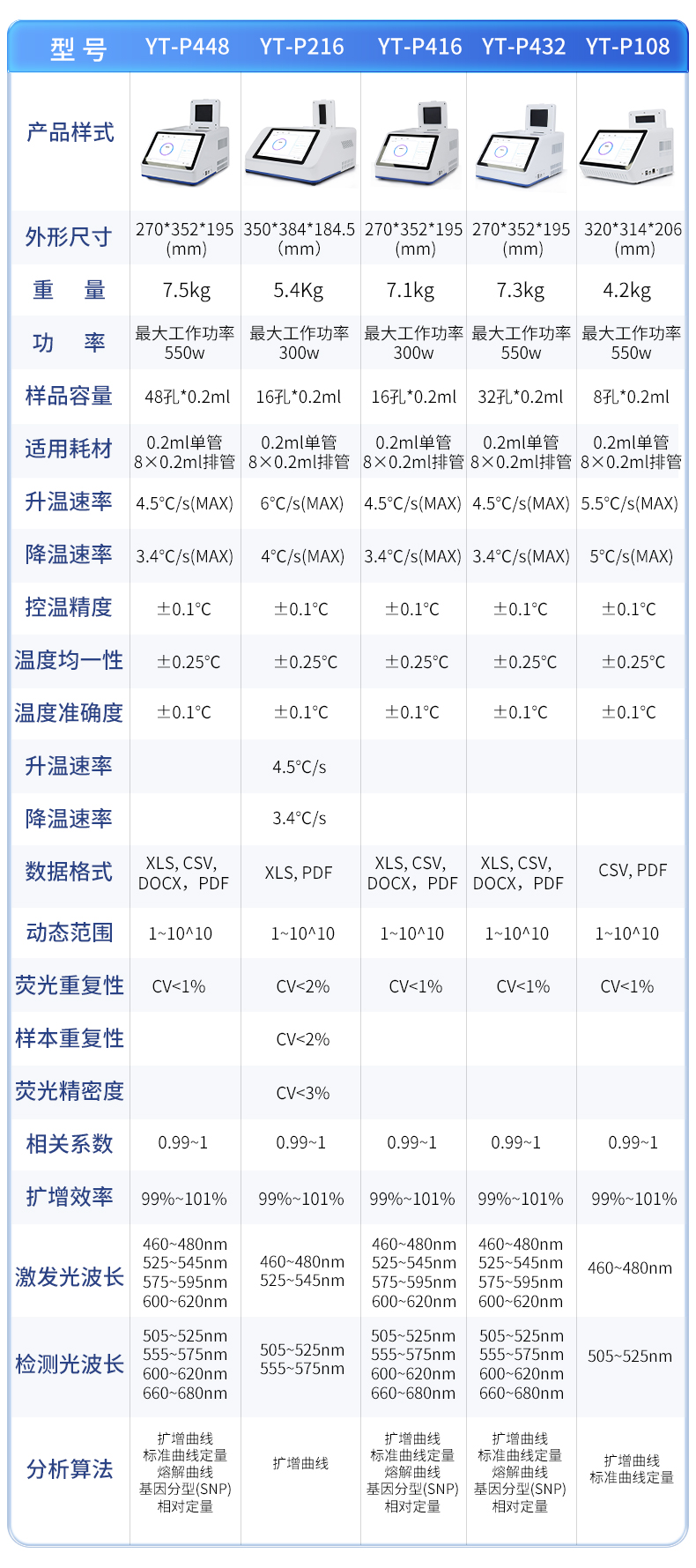 | 基本性能 | 外形尺寸:320*314*206 (mm) | 重量:4.2kg | 電源:220V | 功率:**工作功率550w | 操作系統:自帶Android操作系統 | 系統語言:中英文實時切換 | 操作環境參數 | 操作環境溫度:18~35℃ | 操作環境相對濕度:0%~85% | 運輸及儲存溫度:-20~55℃ | 運輸及儲存相對濕度:0%~85% | 系統性能 | 樣品容量:8孔*0.2ml | 樣品容積:15~100ul | 適用耗材:0.2ml單管、8×0.2ml排管 | 控溫范圍:4~99℃ | 熱蓋溫度:30℃-108℃(默認105℃,熱蓋溫度可調) | 溫控方式:高性能進口半導體 | 升溫速率:5.5℃/s(MAX) | 降溫速率:5℃/s(MAX) | 控溫精度:±0.1℃ | 溫度均一性 :±0.25℃ | 溫度準確度 :±0.1℃ | 操作功能:預設項目和分析參數,操作簡單方便 | 報告:支持報告自定義模塊 | 斷電保護:可以一鍵重啟中斷的實驗 | 儀器信息:擁有故障記錄,分析,提示的功能,更方便遠程解決問題 | 分析算法:擴增曲線,標準曲線定量 | 支持HRM檢測:支持 | 數據導出:可將實驗結果以圖形和表格的形式直接導出;詳細的數據報告內容包括實驗條件,數據坐標和表格,數據分析參數。 | 數據格式:CSV, PDF | TouchDown功能:支持時間和溫度遞增遞減模式 | 熒光檢測系統性能 | 檢測靈敏度:可檢測單拷貝基因 | 動態范圍:1~10^10 | 熒光重復性: CV<1%(使用某品牌試劑做8孔均一性實驗,8個孔的Ct差值保持在0.5以內,CV保持在1%以內。) | 相關系數:0.99~1(每種濃度3個重復,梯度曲線的相關系數>0.99,擴增效率保持在99%~101%之間) | 擴增效率:99%~101% | 可信度:區分1000與2000拷貝濃度差異 | 激光光源:大功率LED(免維護,壽命長) | 檢測器:高靈敏度光電傳感器 | 激發和檢測傳播介質:耐高溫專業導光光纖 | 激發光波長 :460nm~480nm | 檢測光波長: 505nm~525nm |